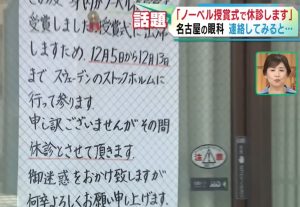 「ノーベル賞の授賞式に参加するためストックホルムに行くので休診にします」